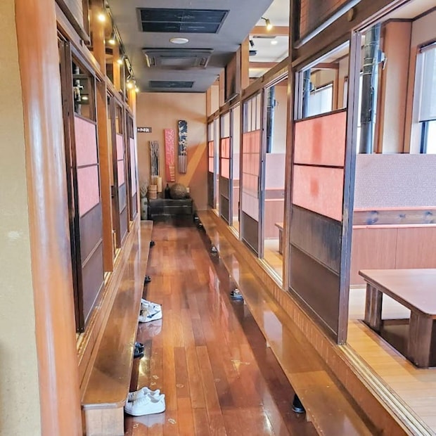 廊下の両側には仕切りのある半個室タイプのテーブル席が並び、周囲を気にせず食事を楽しめる造りになっています。