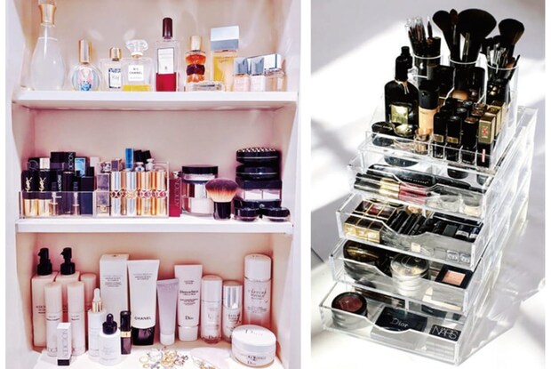右/使用頻度の高いベースメイク、カラーメイク、ツールはクリアなアクリルのメイクボックスに。左/棚の上段にフレグランス、中段にメイクもの、下段にはスキンケアを並べて見せる収納に。