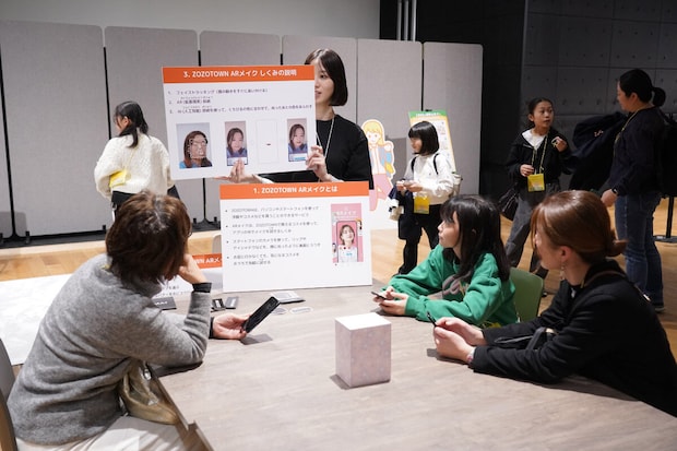 ZOZOのブースでは、スマホで足の3Dサイズや肌の色を計測するツールを体験。独自のAIやAR技術が、自分にぴったりのファッションを見つけるサービスを支えている仕組みを興味深く学んでいました。
