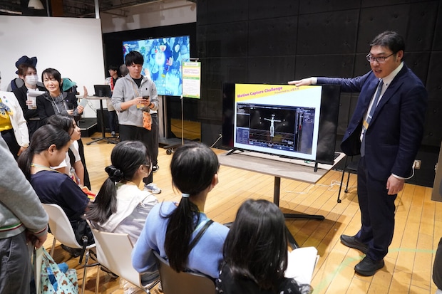 上智大学理工学部のブースでは、顔にマーカーを貼り、自分の表情をデジタル情報として可視化するモーションキャプチャーに挑戦しました。