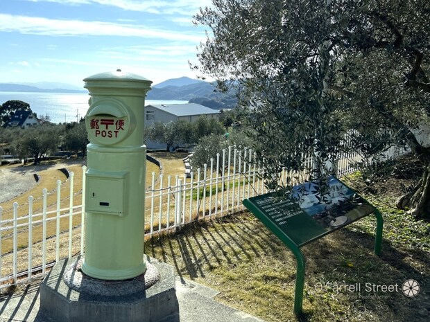 昔から平和と幸福の象徴とされるオリーブ。そのオリーブ色に染められたポストが、丘の上に立っています。ポストカードを購入して誰かに手紙を出したくなりますね。