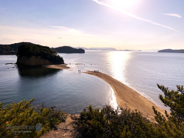 手前の弁天島の上には、恋人の聖地「約束の丘展望台」があり、5分ほど登れば頂上に到着、瀬戸内海の島々や、屋島などが眺められます。エンジェルロードを見下ろしつつ、幸せの鐘を鳴らすこともできます。