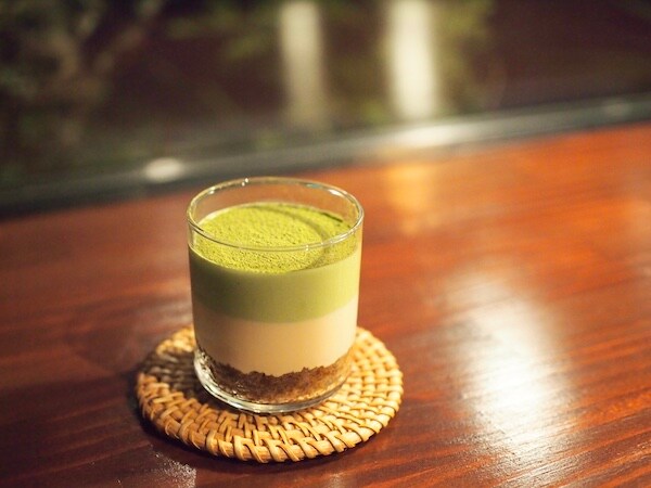 「出雲抹茶とエスプレッソのレアチーズケーキ」800円は、なめらかな口どけのレアチーズケーキを抹茶と浅煎りエスプレッソの二層仕立て。底にはエスプレッソをたっぷり染み込ませた米粉のスポンジケーキが敷かれている。テイクアウトはなく、店内飲食のみでの提供だ。