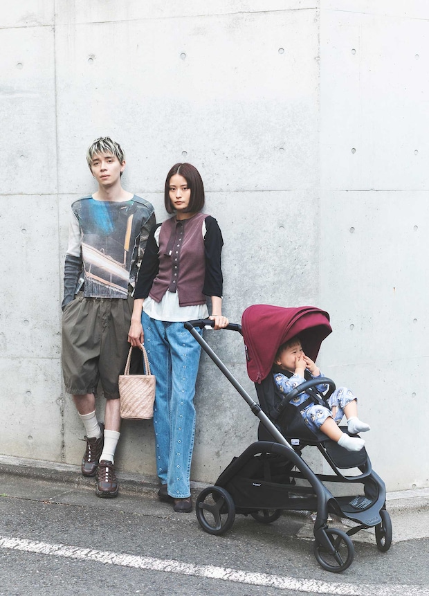 ワインレッドのベビーカーが主役になるように、全体は落ち着いた雰囲気に。パパの柄物も色味を揃えることで、大人な統一感のある着こなしに昇華。ベビーはインヤン柄のそう柄ロンパースをまとって、気分が明るくなるアイテムを取り入れつつも、家族でリンク感のあるスタイルに。ママはトップスをレイヤードしたりと、遊び心をひとさじ。