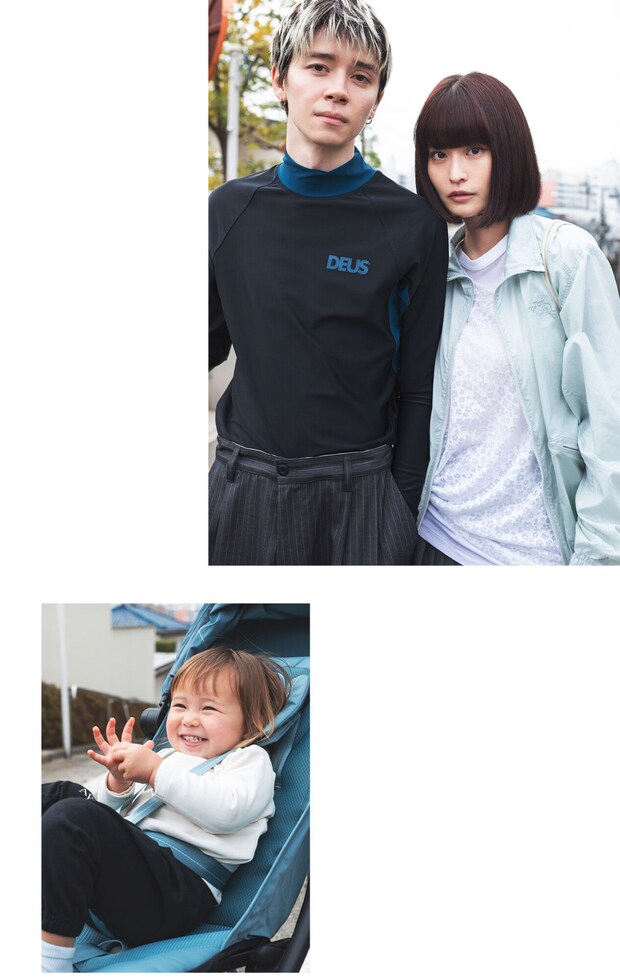 [papa]トップス¥13,200/デウス エクス マキナ(ジャック・オブ・オール・トレーズ プレスルーム)、ボトムス¥9,999/レッドキャップ×フリークス ストア(フリークス ストア渋谷)、スニーカー¥14,630/ナイキ スポーツウェア(ナイキ カスタマーサービス)