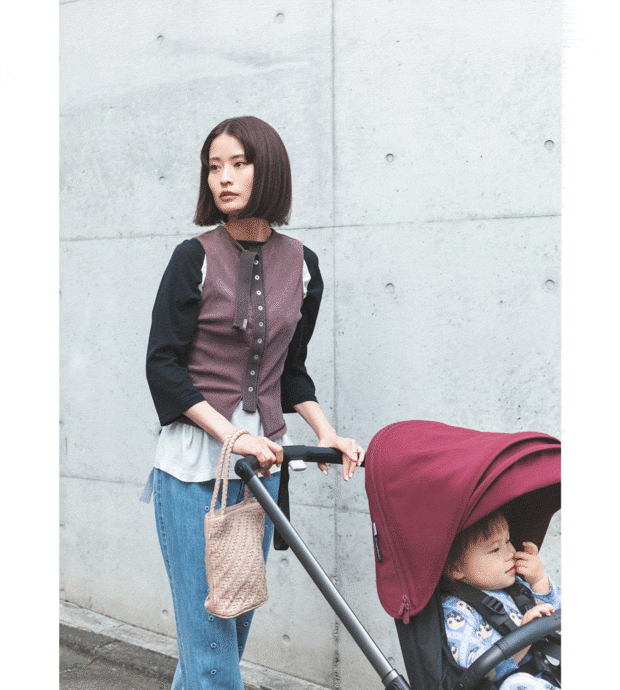 [mama]ラグラントップス¥18,700/オブラダ(シンチ)、タンクトップ¥22,000、ボトムス¥44,000/ともにコトハヨコザワ(オン・トーキョー ショールーム)、バッグ¥25,300/ベンビエン(モットハウス・トーキョー)、ブーツ¥25,300/ALM.