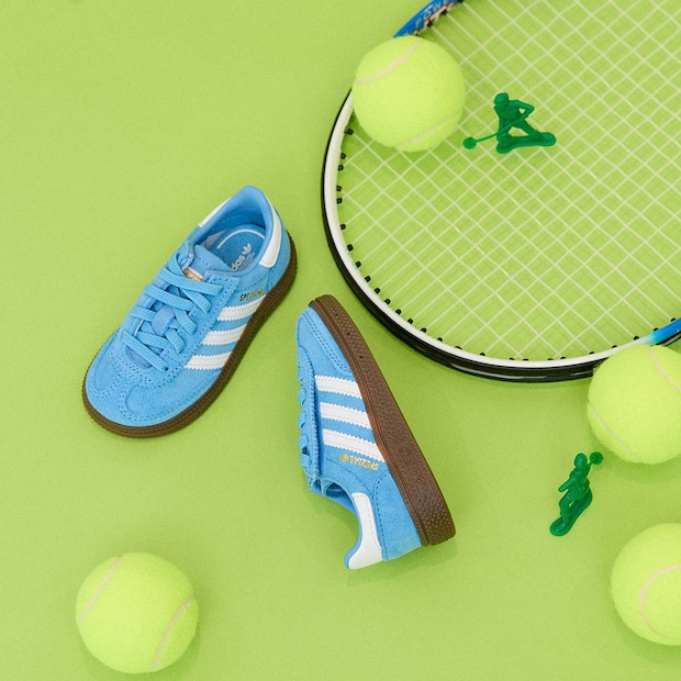 1970年代のクラシックなハンドボールシューズを、キッズ向けにアレンジした『adidas』の人気モデル「ハンドボール スペツィアル」。伸縮性のあるゴム製シューレースと面ファスナー式ストラップを組み合わせた設計で、履き口が大きく開くので、子どもが自分でスニーカーを履く練習をするのにもちょうどいい一足。足にやさしくフィットする履き心地で、鮮やかなブルーがコーデのアクセントに。