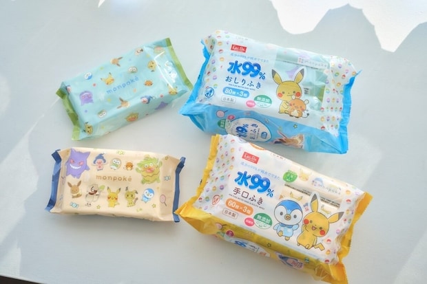 レックより、成分の99%が純水でできたおしりふきと手口ふきが登場! 便利な3個セットで、モンポケのなかまたちの楽しいデザインです。(発売中)