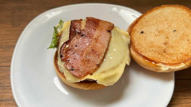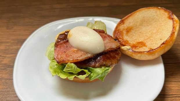 バンズを外してみると、ベーコンの上にトッピングされた半熟風卵(モスバーガーのオリジナルたまご加工品)がお目見え!