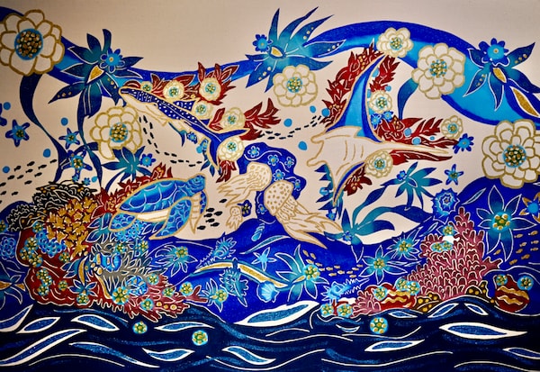 伝統の紅型を鮮やかな色彩で表現する新垣優香さんのデザインで存在感のあるこの缶は、食べ終わったあとにインテリアとして愉しむことができるのも特徴。