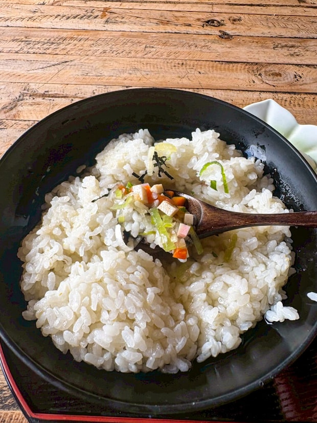 一見、白飯にお出汁が掛かっただけに見えますが、中に鶏肉、人参、椎茸、蒲鉾、三つ葉が隠されています^ ^