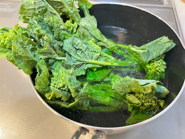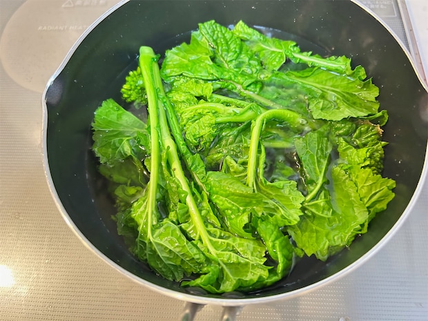 1.鍋に塩(適量)と水を入れて沸かし、菜の花の根元を入れて30秒、葉先もつけて30秒茹でてザルにあげる。