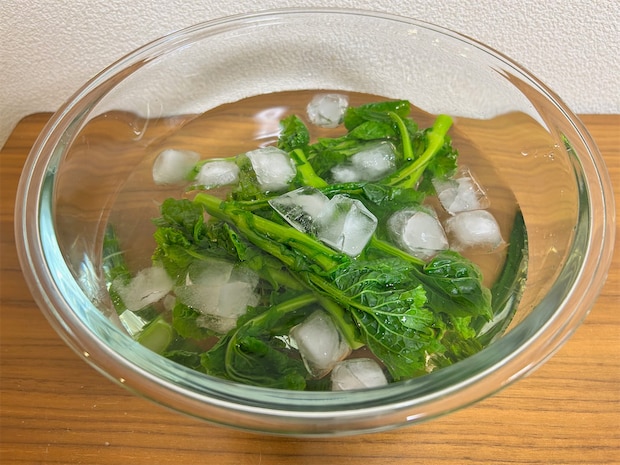 茹でた後急速に冷やすことで、菜の花が鮮やかな色に仕上がります!