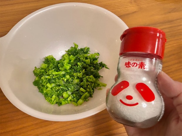 さらに、ササっと振った味の素®が、菜の花やしらすの旨味をより引き出してくれています。白ゴマの香ばしさも相まってお代わりが止まらない!