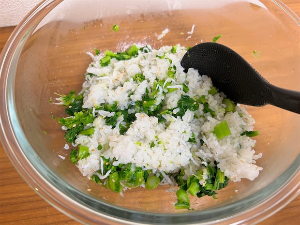 4.温かいご飯に釜揚げしらすと3の菜の花、塩(小さじ1)、白ゴマを加えて混ぜ合わせる。