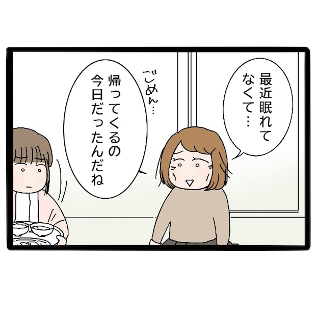 「大丈夫ですか?」と声をかけると、みずほ先輩は力のない表情で「最近眠れてなくて・・・ごめん、帰ってくるの今日だったんだね」と言いました。私が実家に帰る日すら分からなくなるほど、育児に疲弊しているのでしょうか。