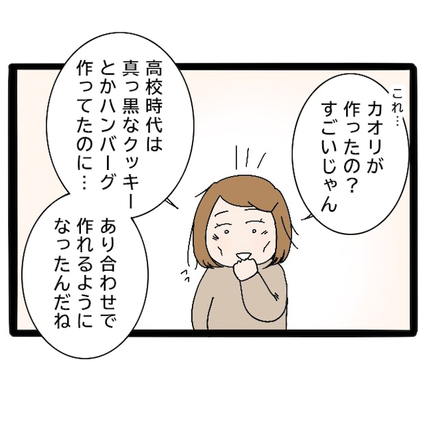すると、みずほ先輩の表情がぱっと明るくなり、「これ、カオリが作ったの?すごいじゃん!高校時代は真っ黒なクッキーとかハンバーグ作ってたのに・・・あり合わせで作れるようになったんだね」と笑いながら褒めてくれました。