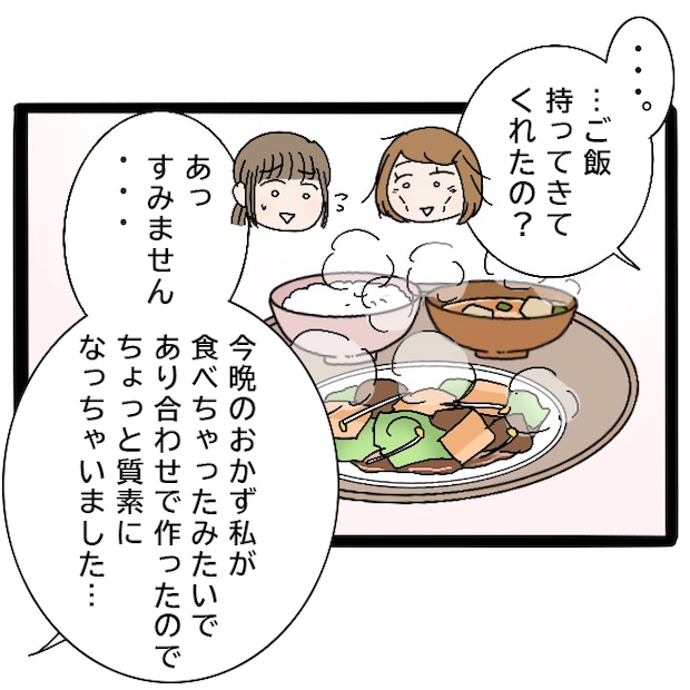 しかし、みずほ先輩は私の質問に答えることなく、「・・・ご飯持ってきてくれたの?」と話題を変えました。私はとっさに、「あっすみません、今晩のおかず私が食べちゃったみたいで、あり合わせで作ったのでちょっと質素になっちゃいました」と謝ります。
