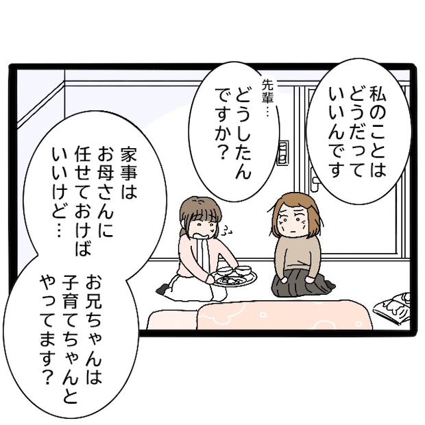 私はみずほ先輩に、「私のことはどうだっていいんです、先輩どうしたんですか?家事はお母さんに任せておけばいいけど、お兄ちゃんは子育てちゃんとやってます?」とたずねました。ここまでやつれてしまうなんて、もしかすると兄が育児に関わっていないせいなんじゃないか・・・そんな不安が頭をよぎります。