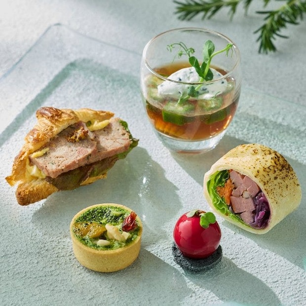 セイボリーは、柑橘の香りが爽やかな「スモークダックとオレンジコンフィチュールのトルティーヤ」や見た目もかわいらしい「クランベリーとフォアグラのパルフェ」など、軽めの構成で甘いメニューの合間に挟みやすいバランスがうれしい。