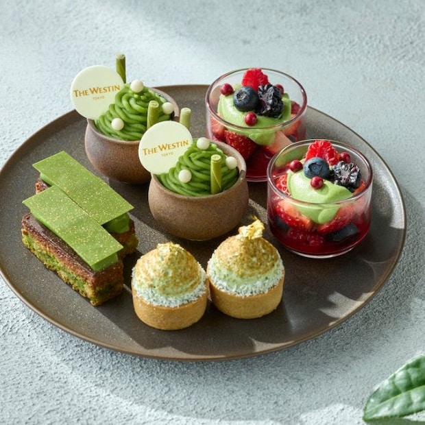 スイーツは、抹茶に加えベリーや柑橘の要素が入り、色のコントラストが印象的。甘酸っぱいベリーと抹茶のほろ苦さが相性抜群の「赤いベリーと抹茶のグラス」や、なめらかな口どけの「抹茶とアーモンドミルクのブランマンジェ」など、全8種のスイーツを楽しめる。