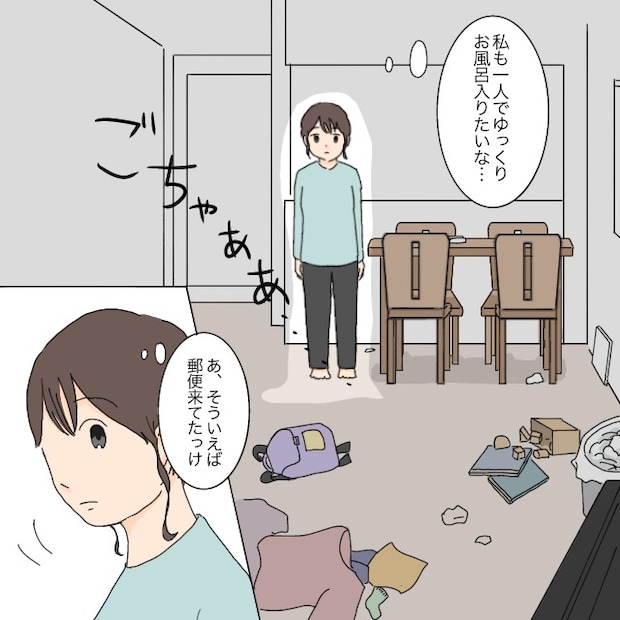 夫がお風呂に行った後、私は散らかったリビングを見ながら「私も1人でゆっくりお風呂入りたいな・・」とぼんやり思いました。午前中にリセットしても、寝る前にはおもちゃや洗濯物が散乱しているリビング。もしかしたら、夫は私が毎日片付けていることなんて気づいていないかもしれません。報われない気持ちを覚えつつ、そういえば昼間に郵便物が届いていたことをふと思い出しました。