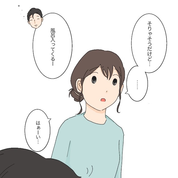 たしかに遊び疲れていた分いつもよりすんなり寝付いたのは事実です。でも、その手前がいつも以上に大変だったのです。平日ほとんど家にいない夫は、私が日々の大変さを口にしてもいまいちピンと来ていない様子。モヤモヤしながら「そりゃそうだけど・・」と言いかけると、疲れている夫は「風呂入ってくるー」とさっさとお風呂へ行ってしまいました。夫に悪意がないのは分かっているのですが、私が感じている大変さと夫が想像している大変さにはすごく差があるような気がしてモヤモヤしてしまうのです。