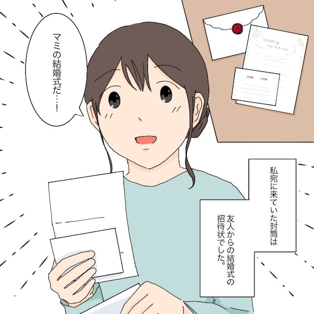 郵便物を確認すると、その中にオシャレな封筒が目に留まりました。それは、高校時代の友人マミからの結婚式の招待状でした。「マミの結婚式だ・・!」一気に昔の楽しかった思い出がよみがえり、さっきまでのモヤモヤを忘れさせてくれました。