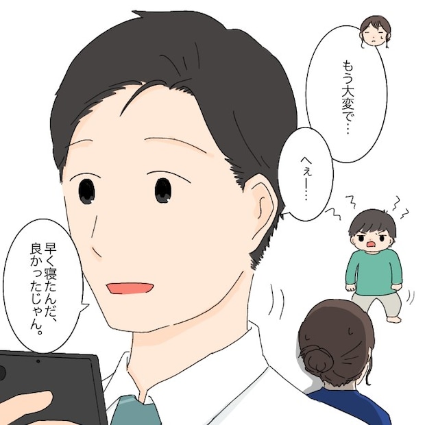 眠くて不機嫌になったゆうたにご飯を食べさせてお風呂に入れ、歯磨きをして・・と本当に大変でした。それを思い返しながら「もう大変で・・」と話すと、夫はスマホを見ながら「へぇー・・早く寝たんだ。良かったじゃん」とさらり。