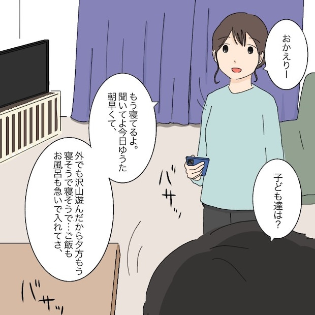 少し前に子ども達の寝かしつけを終えた私は、リビングでようやくゆっくり腰を下ろしたところでした。「おかえりー」と出迎えた私に「子ども達は?」と夫が聞いてきたので「もう寝てるよ。聞いてよ。今日ゆうた朝早くて、外でもたくさん遊んだから夕方もう寝そうで寝そうで・・ご飯もお風呂も急いで入れてさ・・」とこの日の出来事を話し始めました。
