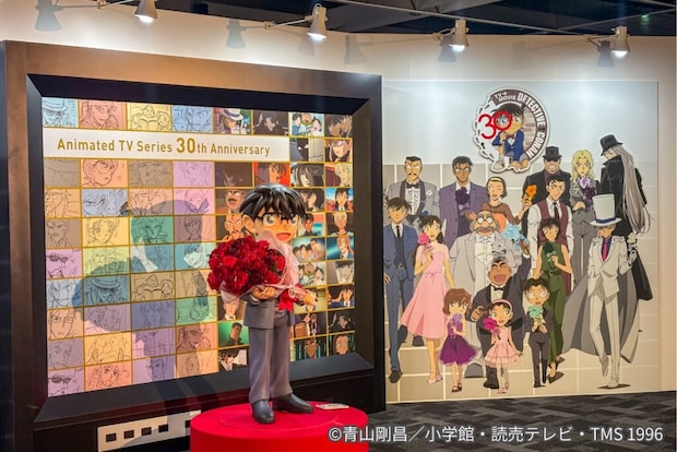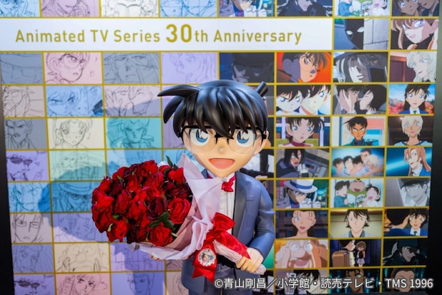 エントランスでは、30周年にちなんで30本のバラを持った江戸川コナンと30人のキャラクターたちがお出迎え!