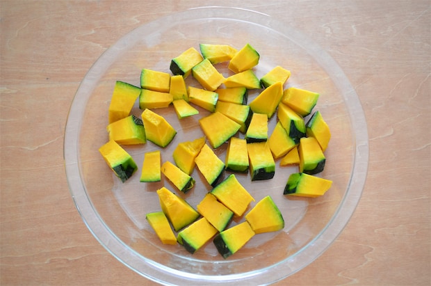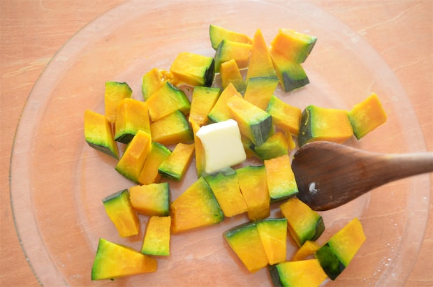 1. かぼちゃは1.5cmのさいの目に切り、耐熱容器に入れてラップをし、500Wの電子レンジで3分加熱する。 温かいうちにバターをまとわせる。