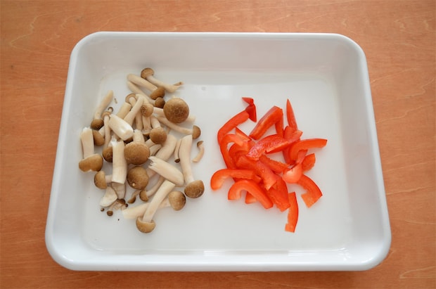 2. パプリカは長さ2cmの短冊に切り、しめじは石づきを切ってほぐしておく。