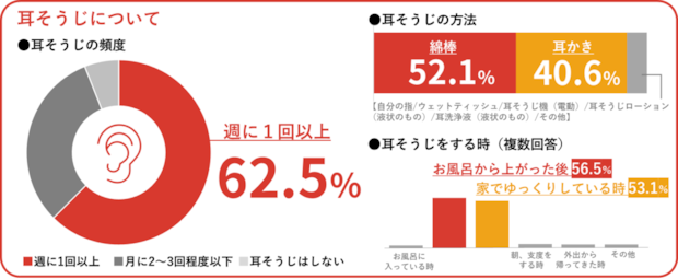 耳そうじの頻度については、62.5%が週1回以上実施。耳そうじの方法は「綿棒」52.1%、「耳かき」40.6%。タイミングは複数回答で「お風呂から上がった後」56.5%、「家でゆっくりしている時」53.1%と、多くの人が日常的に耳そうじを行っており、綿棒や耳かきを使用していることが分かります。