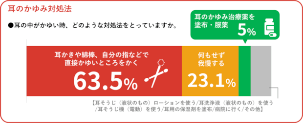 耳のかゆみへの対処法として最も多かったのは、「耳かき・綿棒・指などで直接かく」63.5%、次いで、「何もせず我慢する」23.1%。一方で、「耳のかゆみ治療薬を使用」は約5%と、治療薬を活用している人はごく少数にとどまりました。