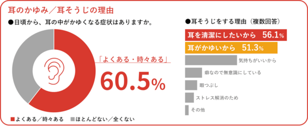 日頃から耳の中がかゆくなる症状の有無について、「よくある」9.4%、「時々ある」51.1%と、6割が日常で耳のかゆみを抱えていることが明らかになりました。また耳そうじをする理由は、複数回答で「耳を清潔にしたいから」56.1%に続き、「耳がかゆいから」が51.3%となり、半数以上がかゆみをきっかけに耳そうじを行っている実態が明らかになっています。