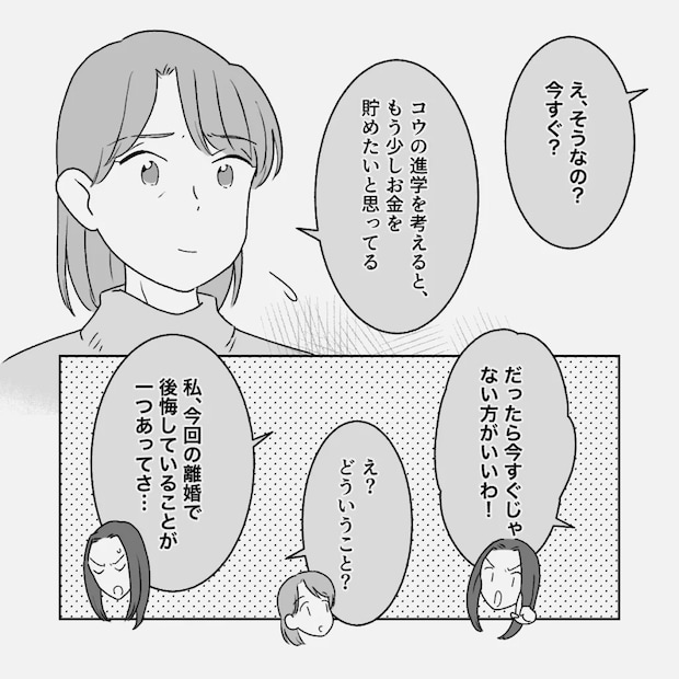 「え、そうなの?今すぐ?」そう聞かれた義母は「コウの進学を考えると、もう少しお金を貯めたいと思ってる」と答えました。すると友人は身を乗り出して「だったら今すぐじゃない方がいいわ!」と言います。「え? どういうこと?」と聞き返すと、友人は「私、今回の離婚で後悔していることが一つあってさ・・・」と、自分の経験を語り始めました。