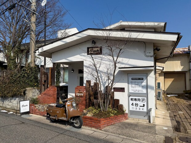 可愛い茶色のバイクが入り口の目印です。