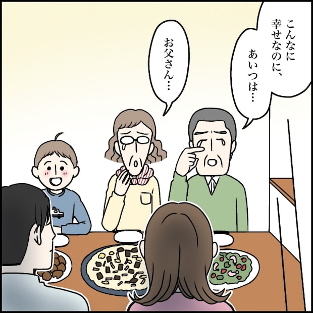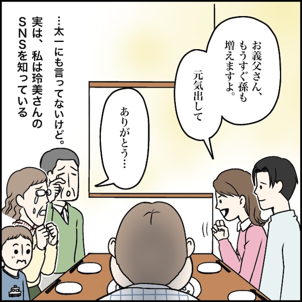 義実家で義両親と勇也さん、れお君たちと一緒に夕食を食べていると、義父が「こんなに幸せなのに、あいつは・・」と涙ぐみ、義母も釣られて「お父さん・・」と目を潤ませました。玲美さんは、家族との幸せを手放してまで推しを応援することを選んだのです。