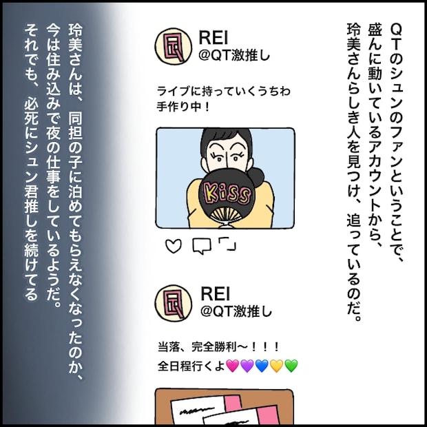 玲美さんは地下アイドルグループであるQTのシュン君のファン。私は、SNSでシュン君について盛んに投稿しているアカウントの中から玲美さんらしき人を見つけ、こっそり動きを追っているのです。玲美さんは、同担の子に泊めてもらえなくなったのか、今は住み込みで夜の仕事をしているようです。それでも、必死にシュン君を推し続けている玲美さん。
