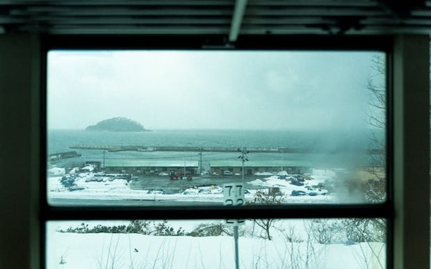 トンネルを抜けた先には陸奥湾がお出迎え。奥にぽつんと浮かぶ島は、無人島である「鴎島(ごめじま)」。窓に付いた雪がシャーベット状になり、ゆっくり景色に溶け込んでいく