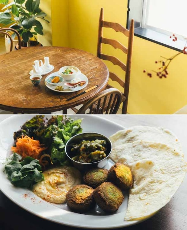 上/朝食のおすすめは、香港の朝粥セット。お粥に3種の点心、プーアル茶などが付いて800円。朝からボリューム満点! 下/ファラフェルがメインの中東プレート1100円