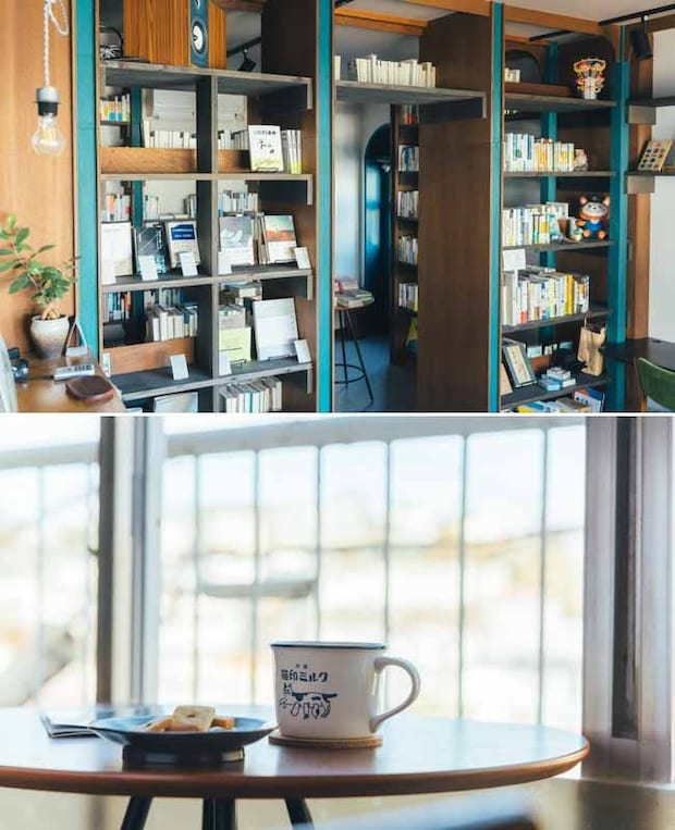 上/「仕事、生活など身近で素朴な悩みに、別の見方を与えてくれるものを意識して選書しています」と小池さん 左/スッキリした香りと苦みが心地よいブレンドコーヒー550円。スパイスや山椒を利かせた3種のクッキー495円