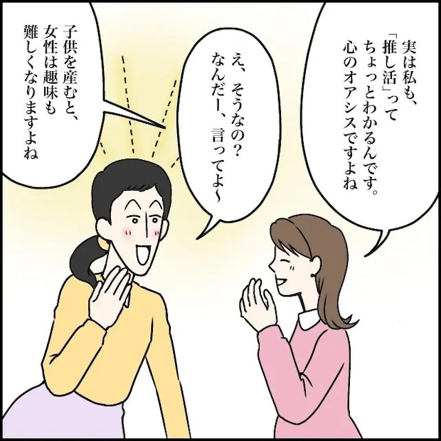 「実は私も『推し活』ってちょっとわかるんです、心のオアシスですよね」と理解者のふりをすると、玲美さんは「え、そうなの?なんだ言ってよ~」と面白いくらい簡単に話に乗ってきました。私はうんうんと頷きながら、「子どもを産むと、女性は趣味も難しくなりますよね」と寄り添うように話します。