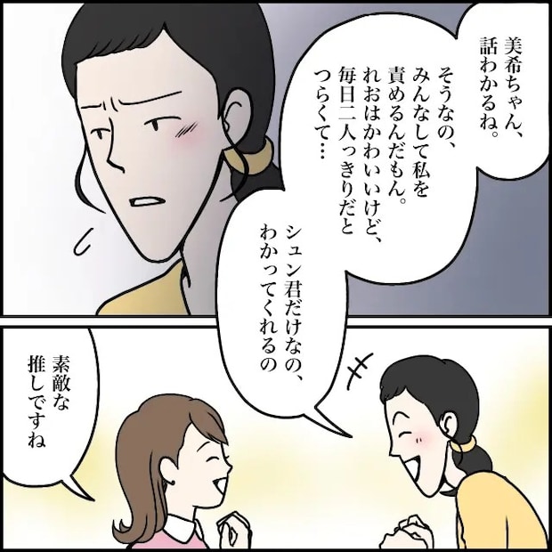 すると玲美さんは切なそうな表情をして「美希ちゃん話わかるね、みんなして私を責めるんだもん、れおはかわいいけど毎日2人っきりだとつらくて・・・シュン君だけなの、わかってくれるの」と本音を打ち明けてきました。私は「素敵な推しですね」と笑いかけます。