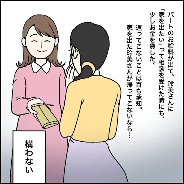 それだけでなく、パートのお給料が出て、玲美さんに「家を出たい」と相談を受けた時も、少しだけお金を貸しました。返ってこないことは百も承知。家を出た玲美さんが義実家に帰ってこないなら構いませんでした。私の目的は『玲美さんを義実家から追い出すこと』ただそれだけ。