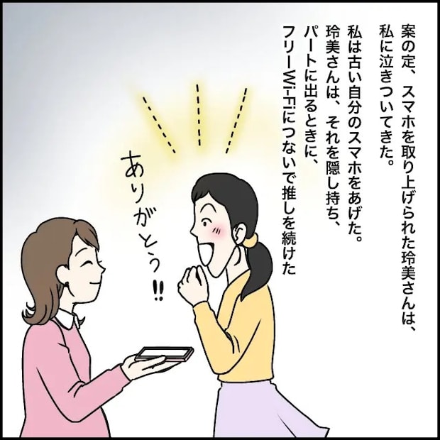 私を理解者だと信じ込んだ玲美さんは、義父からスマホを取り上げられると、まんまと私に泣きついてきました。私が彼女に、昔使っていた古いスマホを手渡すと、玲美さんはそれをバレないようにこっそり隠し持って、パート先でフリーWi-Fiに繋いでシュン君を推し続けました。彼女が休まずパートに出ていたのは、真面目に返済する気があったわけではなく、推し活を続けるためだったのです。