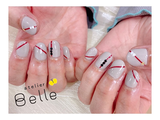 今回は、落ち着いたグレーのネイルカラーをベースに、赤のラインを効かせたスタイリッシュなネイルデザインをご紹介いたします。