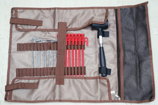 ペグホルダー部分以外に面ファスナーで固定可能なペグハンマー収納と、さらに約44×15cmのファスナー付きメッシュポケットを装備。ペグとそれに関連するアイテムをまとめて収納できるように設計されています。