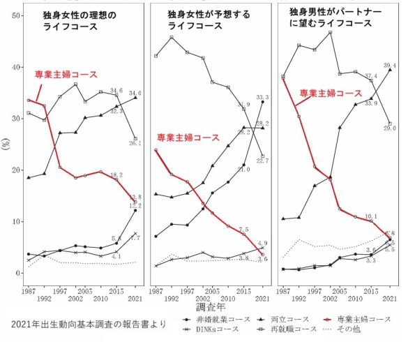 ところが、同じ調査で「独身男性がパートナーに望む結婚後のライフコース」を見ると、専業主婦を希望する男性はたった6.8%しかいません。専業主婦希望の独身男性の割合はずっと減少傾向で、1987年には約40%もいたのが、2021年に6.8%まで激減したのです。